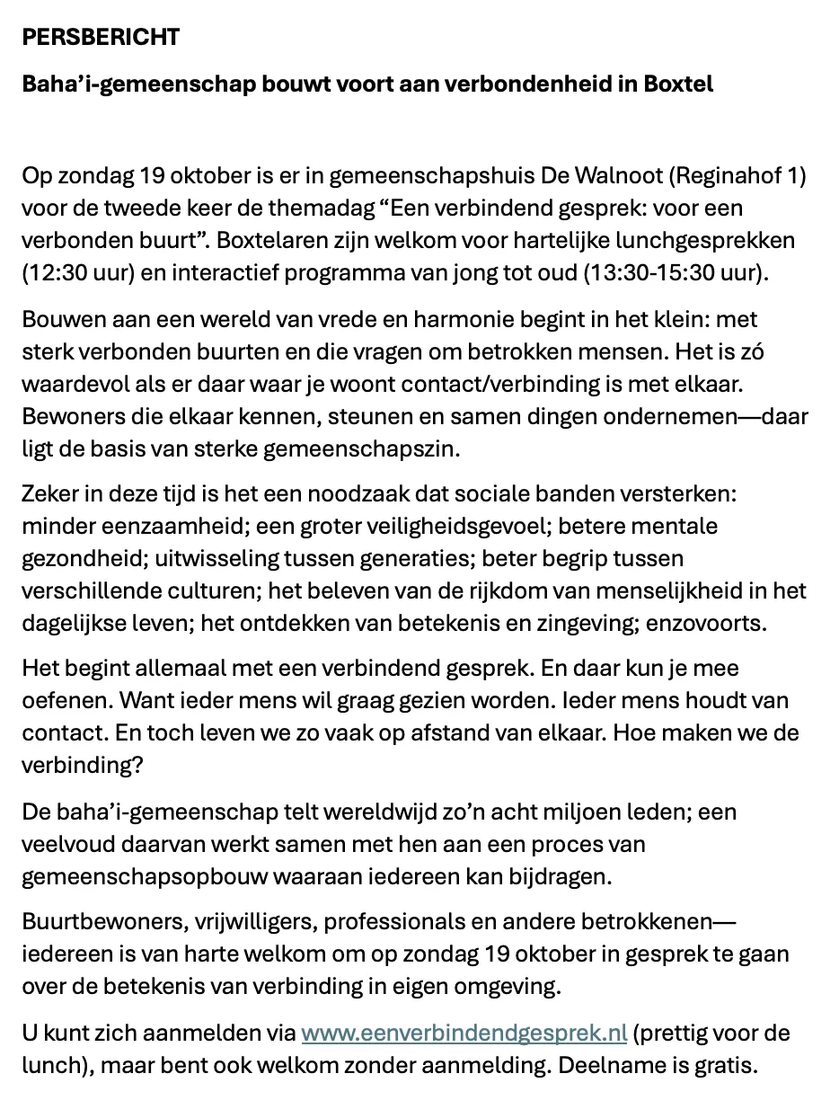 Het initiatief tot 'Een verbindend gesprek' komt vanuit de bahá’í-gemeenschap en is open voor iedereen. Meer verbinding voor een betere wereld begint in eigen buurt. Ook bijdragen? Welkom! Contact via het 'Chatbolletje'.